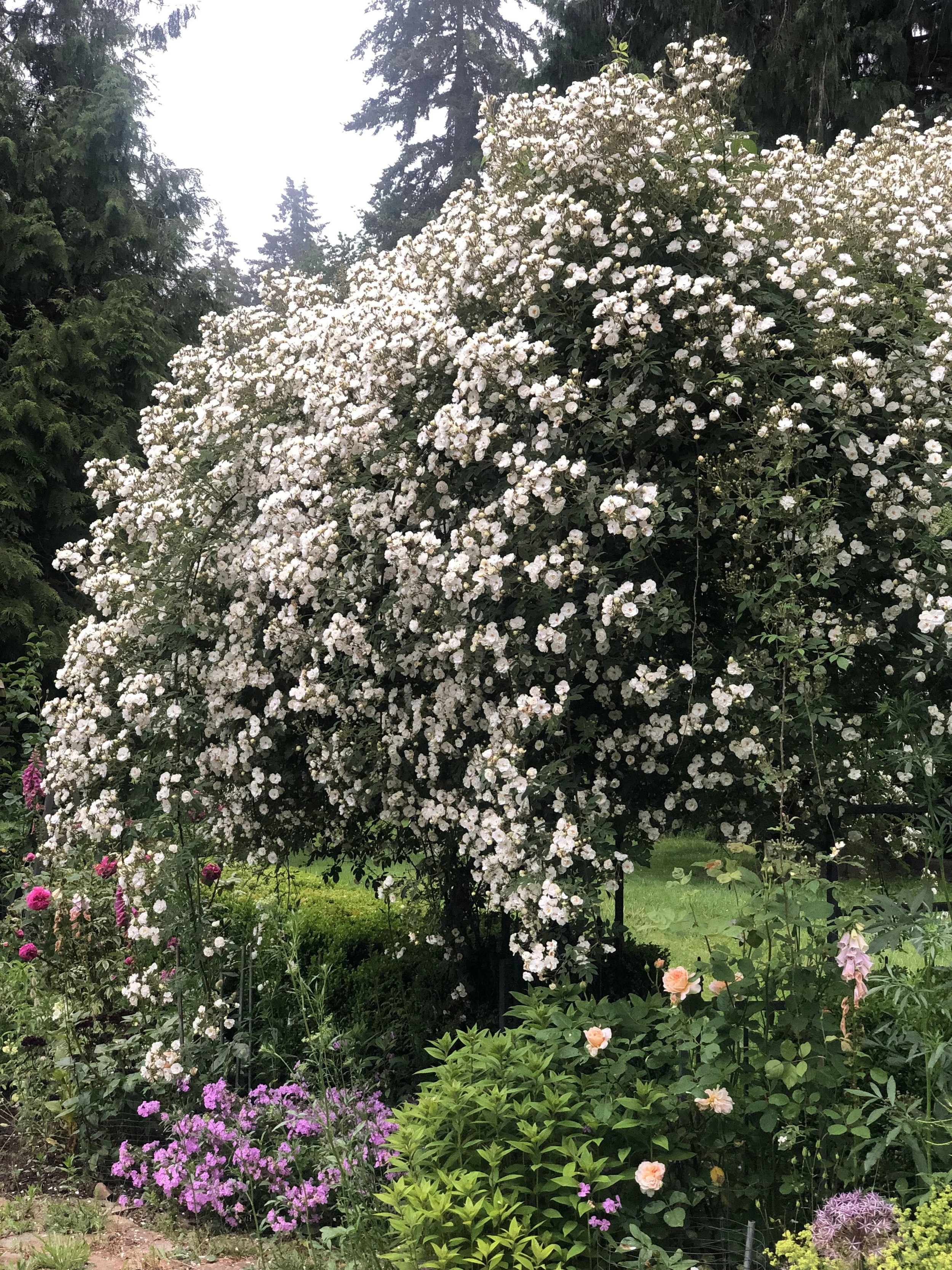 May and June are filled with roses, peonies and hardy annuals. The first to begin the show are climbing and rambling roses. The majority of them are of the vintage variety with mostly open faced, flat laying blooms. They are absolutely covered in bees from morning to dusk.
