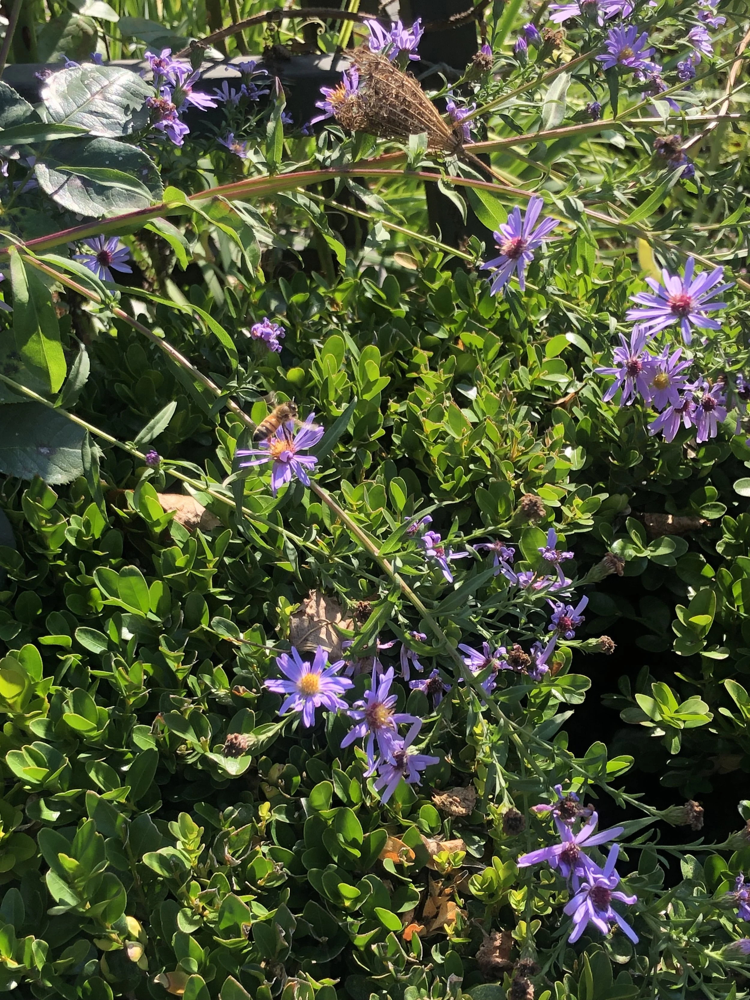Later in the season Dahlias that are open and flat, sunflowers, and asters are all covered in bees on those golden autumn days. The asters in particular. Mine absolutely hum with bee activity.